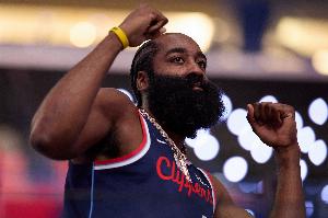 哈登赛季至今场均23.4分5.2板9.3助3.7记三分 命中率46/39/91%