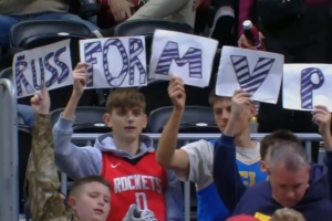 末节7中6爆砍15分!身穿火箭威少球衣的球迷举牌子:威少是MVP