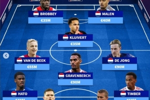 体育资讯10月30日讯 《转会市场》统计了阿贾克斯现役青训球员的巅峰身价情况,并列出一套最贵阵。